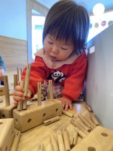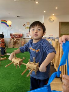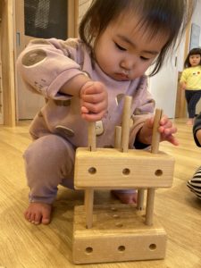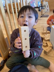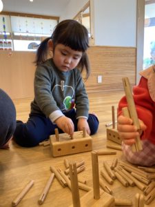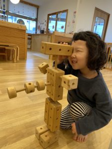 朝登園してくると、今日も木のおもちゃで遊ぶ~!とわくわく。