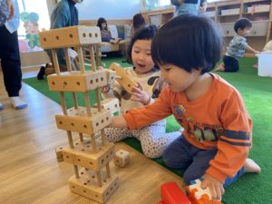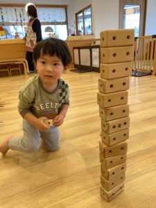 背伸びしながらみんなの背よりも高く積んでいる子もいましたよ♪