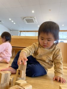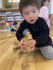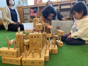 木のおもちゃの箱を出すと、みんなすぐに集まって、思い思いに選んでは、「~~作るぞ!」と両手いっぱいに運んでいきます。