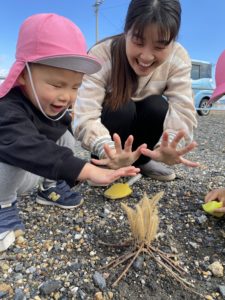 園庭で見つけたねこじゃらしで、先生がなにかを作ってくれましたよ♪カニにも見えるけど、よく見ると石で作った目と鼻が!動物のひげを表現していました~!