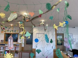 先週から保育室が少しずつ、葉っぱや木の実がたくさんなったジャングルに変身してきました・・・!