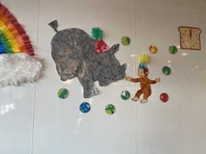窓や壁にはおさるのジョージやその仲間の動物が登場♪なんだかわくわくする雰囲気です。