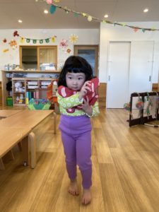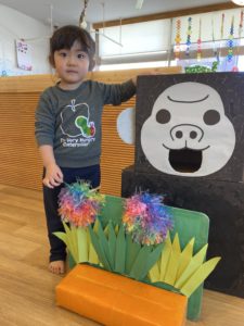 「私たちもバナナだいすき!」と見立て遊びも楽しいね。動物園ごっこを楽しむ中でも「けいこ先生もバナナ好き~?」と先生にも食べ物を分けてくれる優しさいっぱいの子どもたちでした。