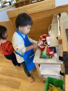 えさをたくさん並べて、「バナナくださ~い!」「どうぞ」とお買い物ごっこをする子も。