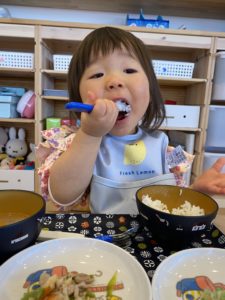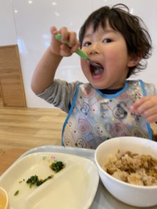 自分でスプーンを持って口に運ぶのも上手になりました。お口が空っぽになってから次の1口を運べるように声をかけながら見守ります。