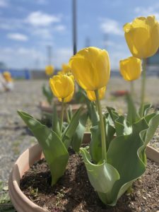 園庭にたくさん咲いたチューリップ。先日のブログでもご紹介しましたが、ついに違う色の花も咲きました!