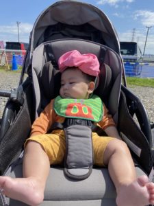 ひなたびっこも気持ちいい~♪まだ大きな帽子がかわいいですね。ぽかぽか太陽の下で眠たくなる0歳児さんたちもいます(- -)zZ