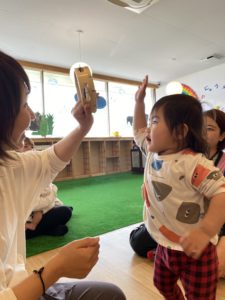タンバリンを叩いて、リズムを返す遊びも、慣れたもの♪とっても元気に参加できました!