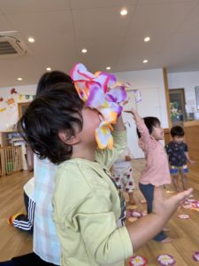 最初はなんだかいつもとちがう雰囲気に戸惑い、泣いていたお友だちもいましたが、前年度やったことがある子どもたちがリトミックが始まるぞ!とわくわくしている様子。とっても意欲的に参加します♪