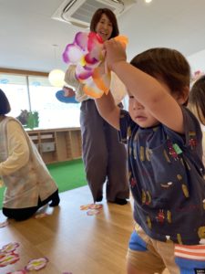 繰り返しやっていく中で自然と身についていく歌やタンバリンを使ったやりとりも、季節に合わせて新たな体験をしていくことも、子どもたちの「わくわく!」を引き出してくれる楽しいリトミックの時間♪