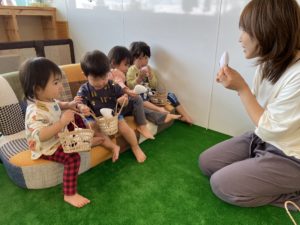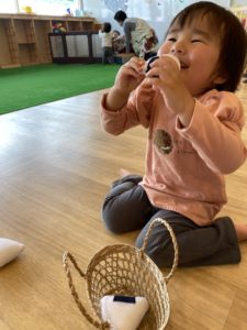 0歳児さんクラスのお友だちにとっては、まずタンバリンという楽器に触れてみることから、新たな経験になりますね♪
