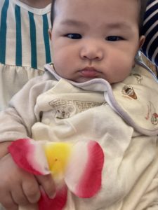 かわいいお花が大好きなお友だち。足の上に1つずつ丁寧に並べています(^^)