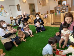 ピアノの絵本を鳴らして、「おめでとう~(^^♪」とみんなでハッピーバースデーを歌うと、とっても嬉しそうに手拍子でアンコール♪
