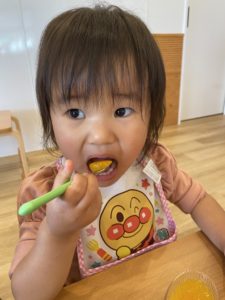 「わーい!みかんだぁー!」と大きなお口でぱくりっ。