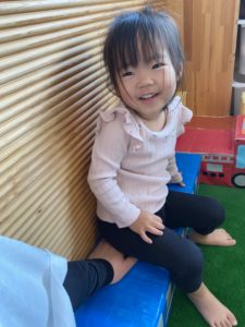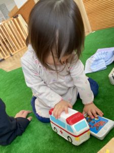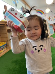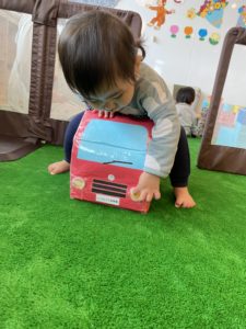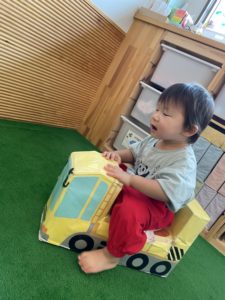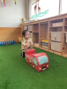 とはいえ、道路の上ばかりを運転するわけじゃありません!時には芝生の上、絵本の上、先生の肩に登っていったり♪子どもたちの自由な発想は膨らんでいきます(^O^)