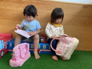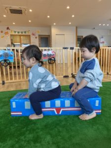 同じ乗り物に乗っていても、絵本を読んだり、買い物ごっこの休憩をしたり。