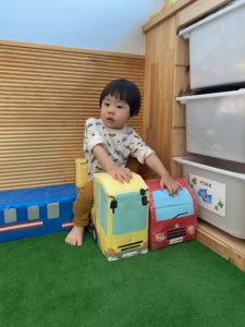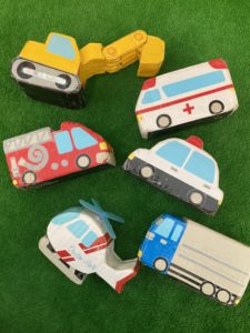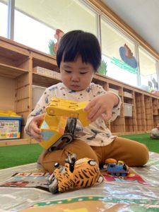 「どれもお気に入りで持ちきれないよ~!」両手いっぱいに乗り物を持って遊んでいます!