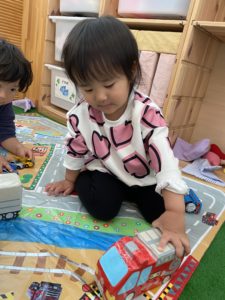 以前ブログでもご紹介した、手作りマップの上で、車を走らせることが子どもたちのお気に入りの遊び。