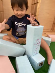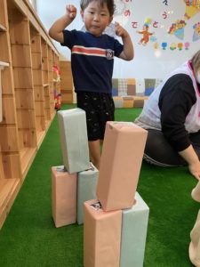 以前は2段、3段ブロックを積んでみて、「見て~!」と喜んでいた子も、バランスを考えたりしながら4段、5段と積めるようになり、高く積むことに楽しみを見出しているようです。
