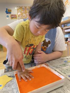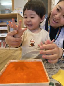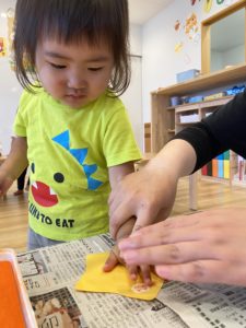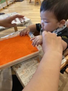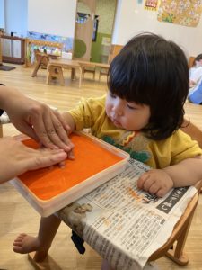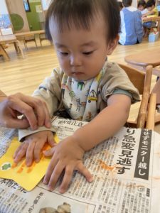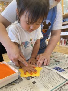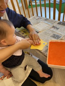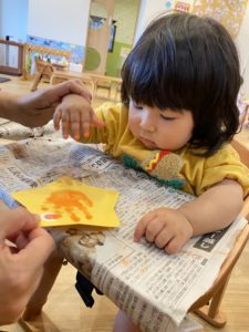 保育園でやる手形スタンプは初めてのお友だち。先生たちが感触どうかな~?と見守る中、とっても嬉しそうに取り組んでいました!