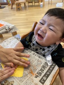 「なんだこの感触~!」と驚いたのか涙がぽろり。先生が優しく声をかけながら、ぺたん!と押す事ができました。