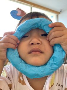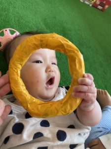 1歳児クラスのお友だちは、わっかの中から友だちを覗き込んで遊んでいました♪