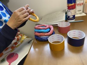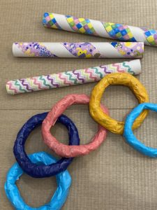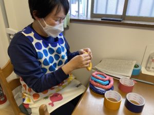 新聞で作ったわっかにビニールテープをぐるぐる!このわっか、年齢によっていろんな遊び方ができるんですよ。