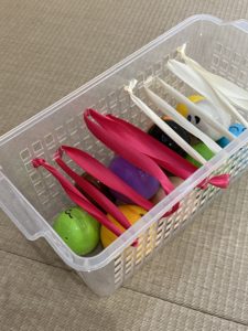 リボンがカゴにいっぱい!ボールを取るのが少し難しくなったり、ボールを落とした時のちょっとした複雑な動きも0歳児にとっては新鮮です。