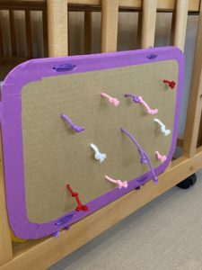 ベビーベットの柵の、0歳児さんの目線に合わせた高さにあったのは、段ボールから出ているいくつもの紐!