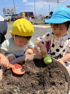 昨日は、春にはチューリップの咲いていた園庭のプランターに、新しく野菜の苗を植えました!