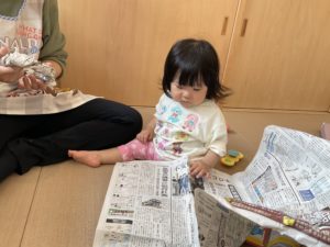 新聞紙は保育園でも雨の日など、よく保育室で遊ぶ材料になります。広げて、触って、感覚や音を楽しむだけでも楽しい!
