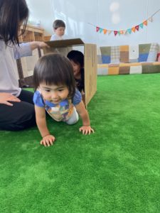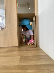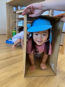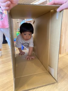 いつもと同じ活動も、ひとつ段ボールというアイテムがあるとなんだかわくわくしてくる子どもたち。