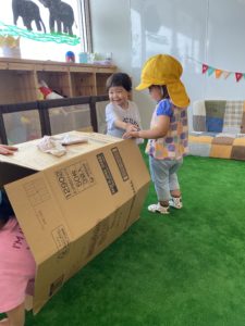 段ボールで荷物が届いた日、畳んで片づける前に、園長先生が子どもたちのところへ♪