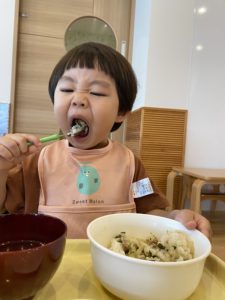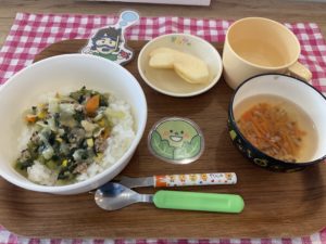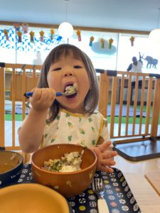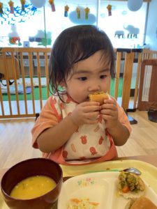 0歳児クラスのお友だちも、先生に口に運んでもらったり、自分の手でつかみ食べをしたりしながら、とっても意欲的に食べられました。