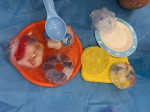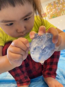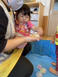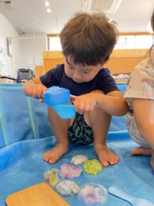 遊んでいるとだんだんと溶けてきて、表面がツルツル滑って上手につかめなかったりしましたが、スプーンやお皿を使って工夫しながら楽しんでいましたよ♪