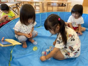 お友だちと一緒に遊ぶことで、氷が水に溶けていく様子や感覚に興味を持ち、楽しく遊ぶことができました♪