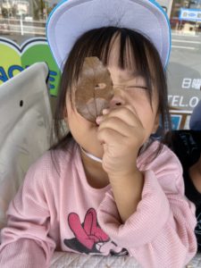落ち葉のパリパリした感触が嬉しかったようで、手のひらで上手に握ってはポイッと投げての繰り返しを楽しみました♪