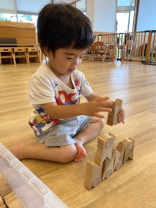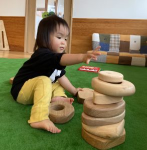 早速積み上げて遊び始めるにじ組(2歳児クラス)の子どもたち。