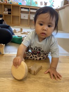 うみ組(0歳児クラス)の子どもたちも木のおもちゃに触っていましたよ。