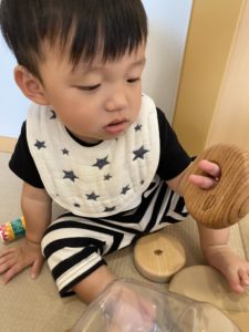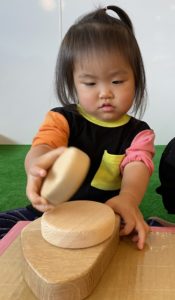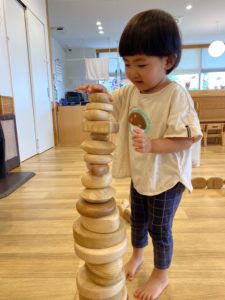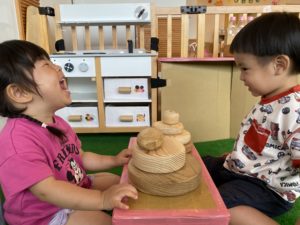 子どもたちはいつもとは違う木のおもちゃに触れて楽しんでいました。
