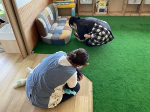 C-NOTE保育園の子どもたちは地震が起きたら「ダンゴ虫のポーズ」をすることを繰り返し先生から教えてもらっています。