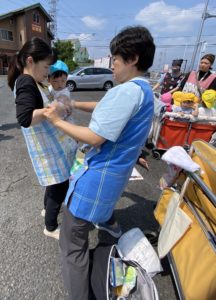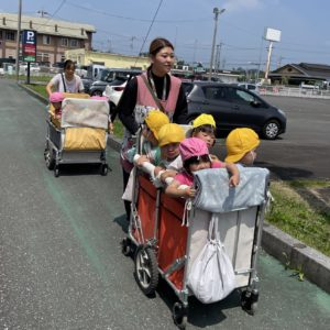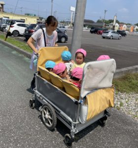 子どもをカートに乗せ、災害用リュックや子どもたちの靴など、必要な物を先生が素早く手分けして持ち出し、避難します。