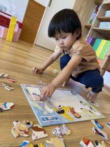 にじ組(2歳児クラス)の子どもたちは久しぶりにパズル遊びをしていました。