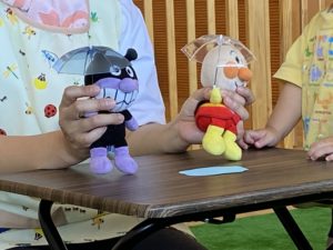 絵本を読み終わるとぬいぐるみを使っていろいろな状況を考えました。