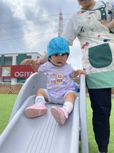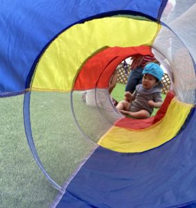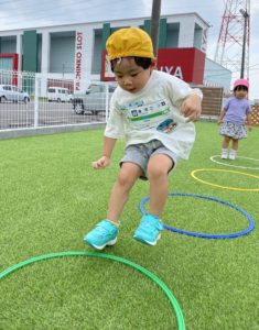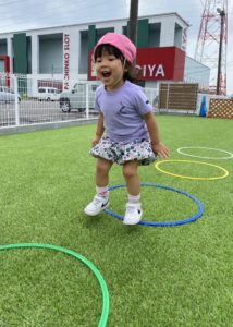 お部屋の中で遊ぶのとはちょっと違って、広々とした園庭で人工芝の感触を楽しみながらくぐります。