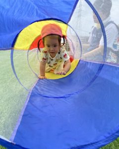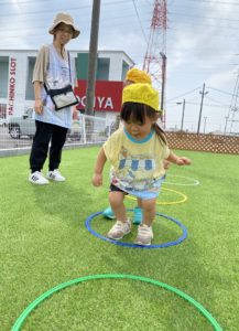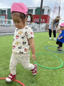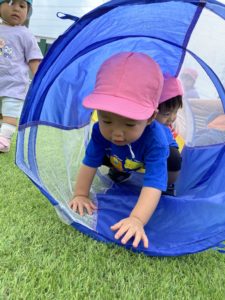 お部屋の中で遊ぶのとはちょっと違って、広々とした園庭で人工芝の感触を楽しみながらくぐります。