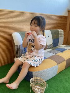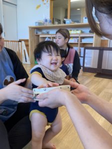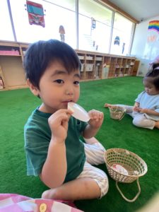 食べる時はくみこ先生が高い音や低い音を出してくれて、子どもたちは音に合わせてガブっと食べたり、小さな口でパクっと上手に食べる真似ができていました(^o^)