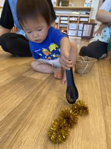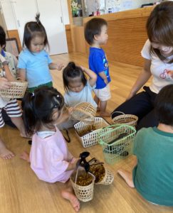 くみこ先生が「栗はトゲトゲがあるから気をつけてね。」と教えてくれて、トングを用意してくれました。