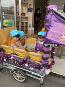 かわいくデコレーションされたカートで出かけるうみ組の子どもたち。