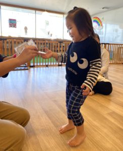 子どもたちはハンナ先生に名前を呼ばれると元気よく前に出てネームカードをもらいに行きます。
